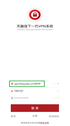 三、打开“天融信TopSAP”APP登录后最小化(登录方法不变,登录地址切换至“vpn.hhxy.edu.cn:8999”);
